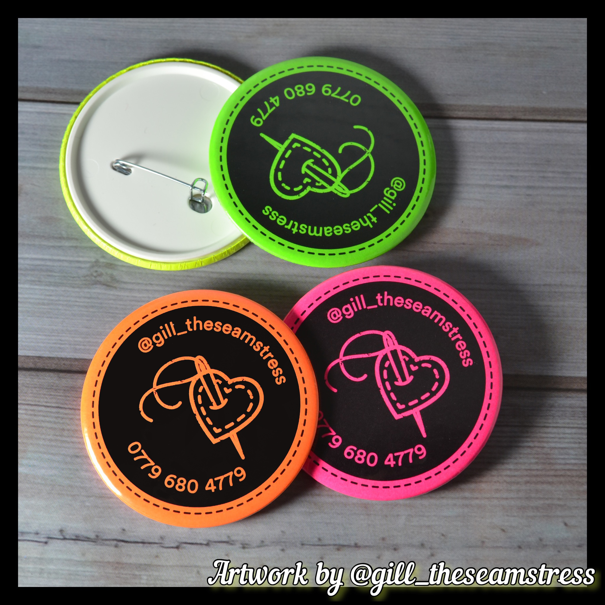 - 58mm Neon Badges with a plastic back and metal pin