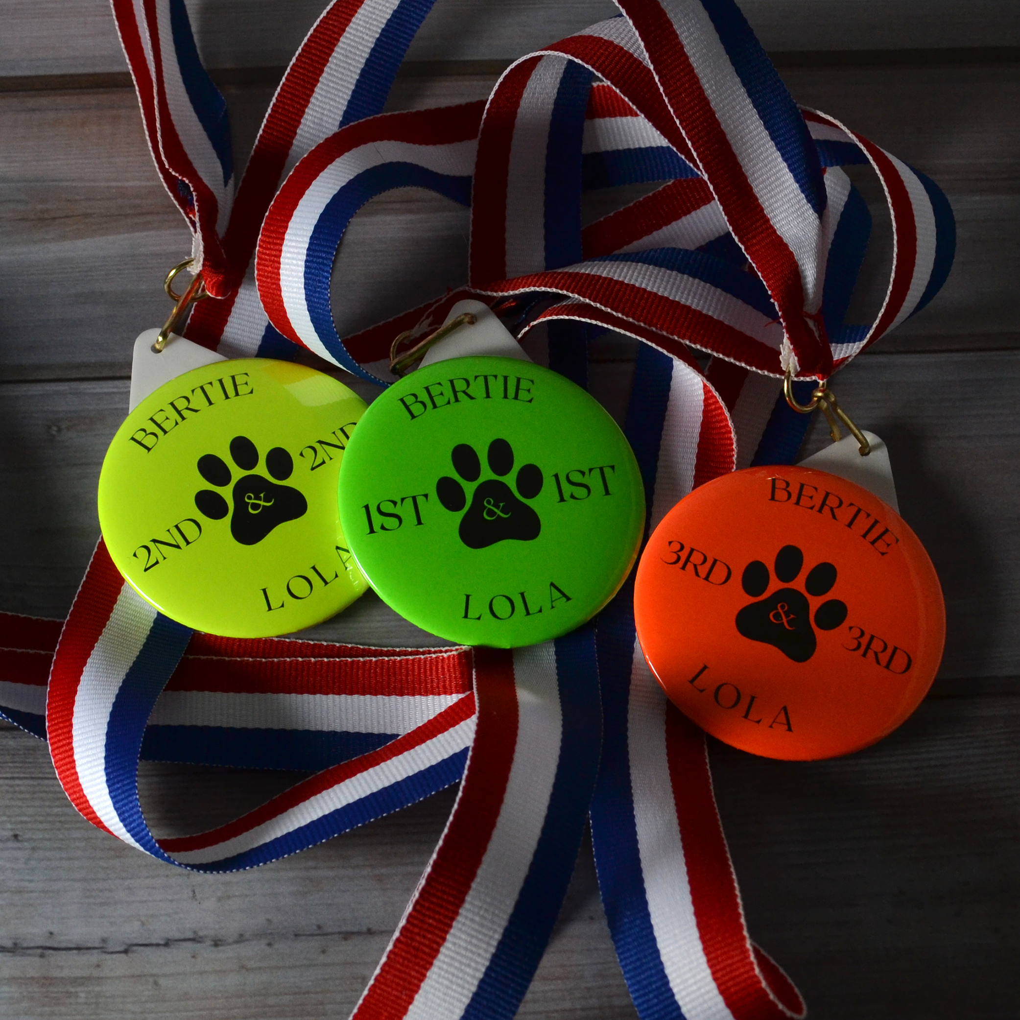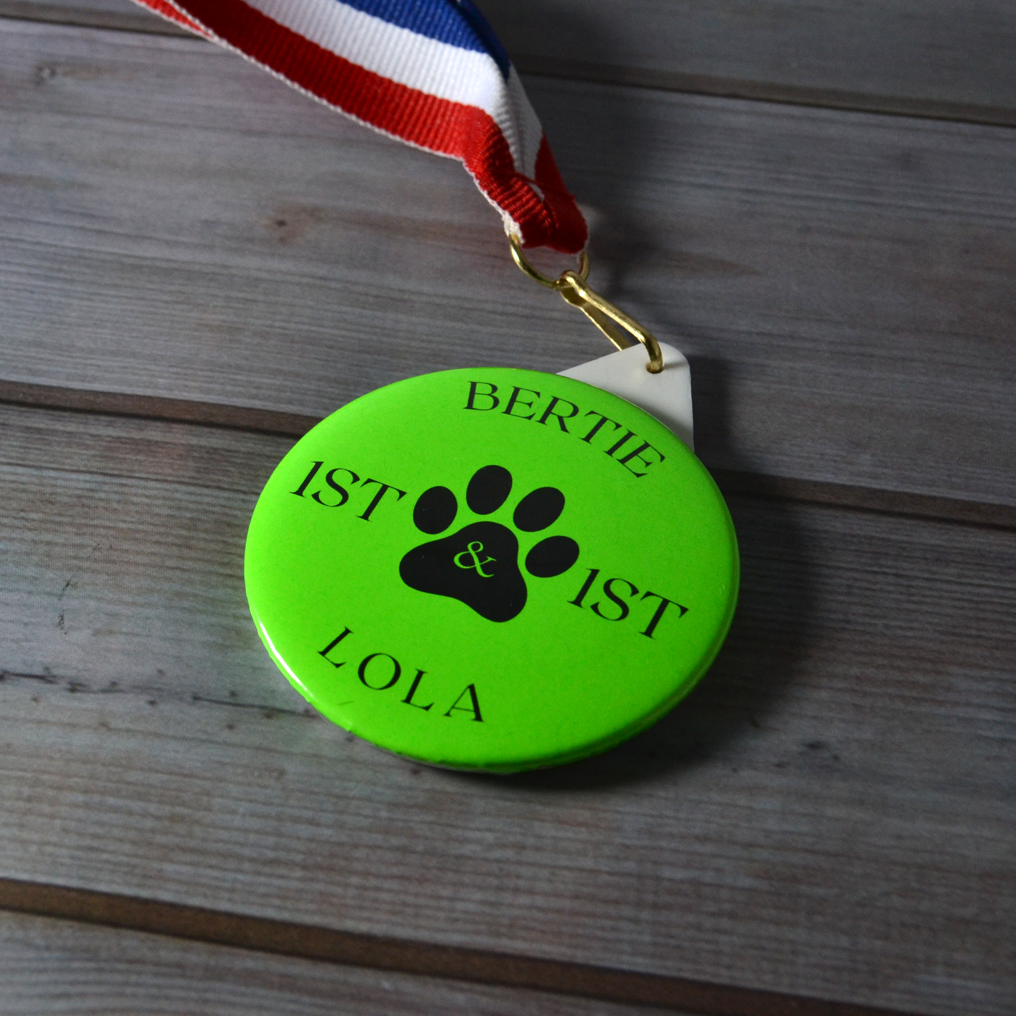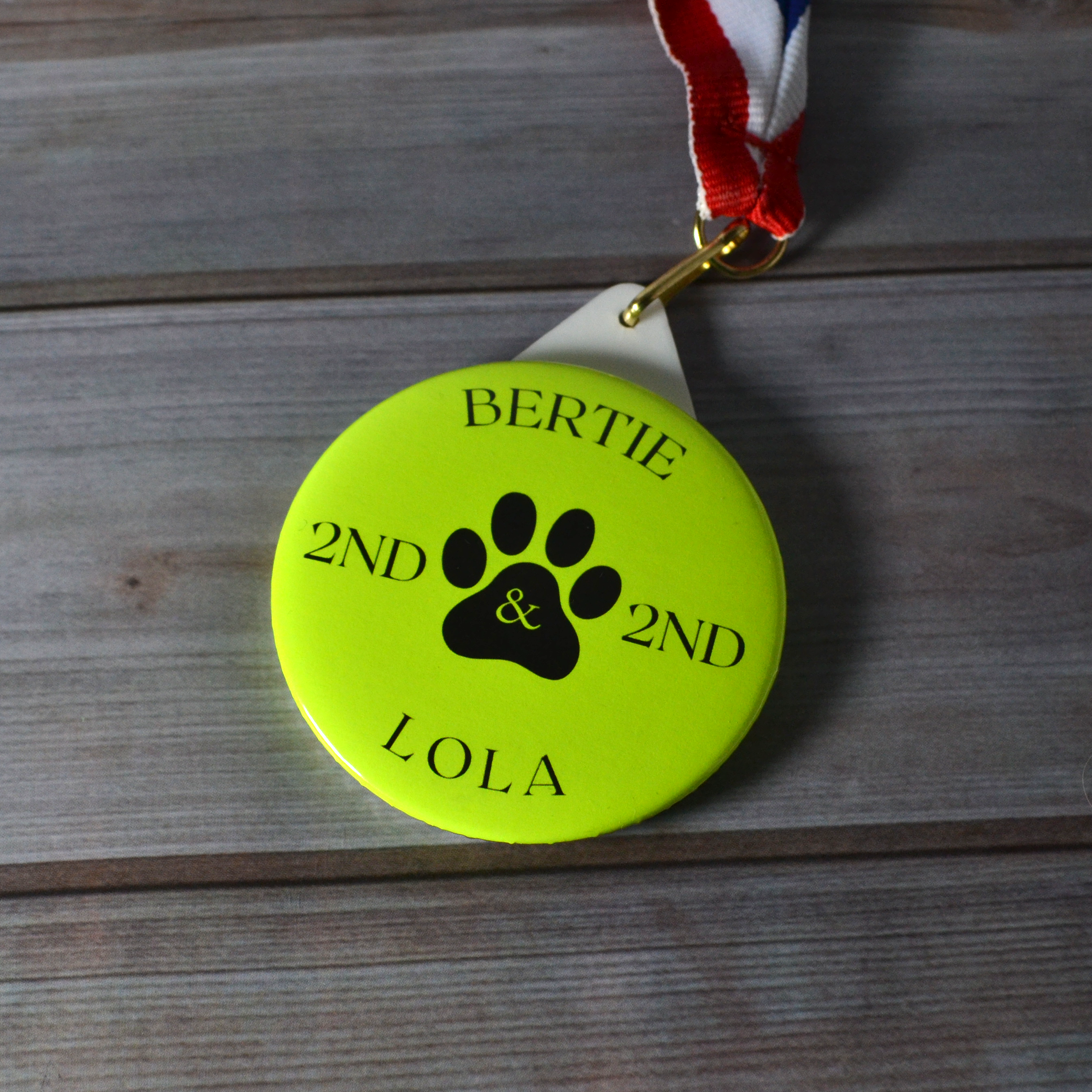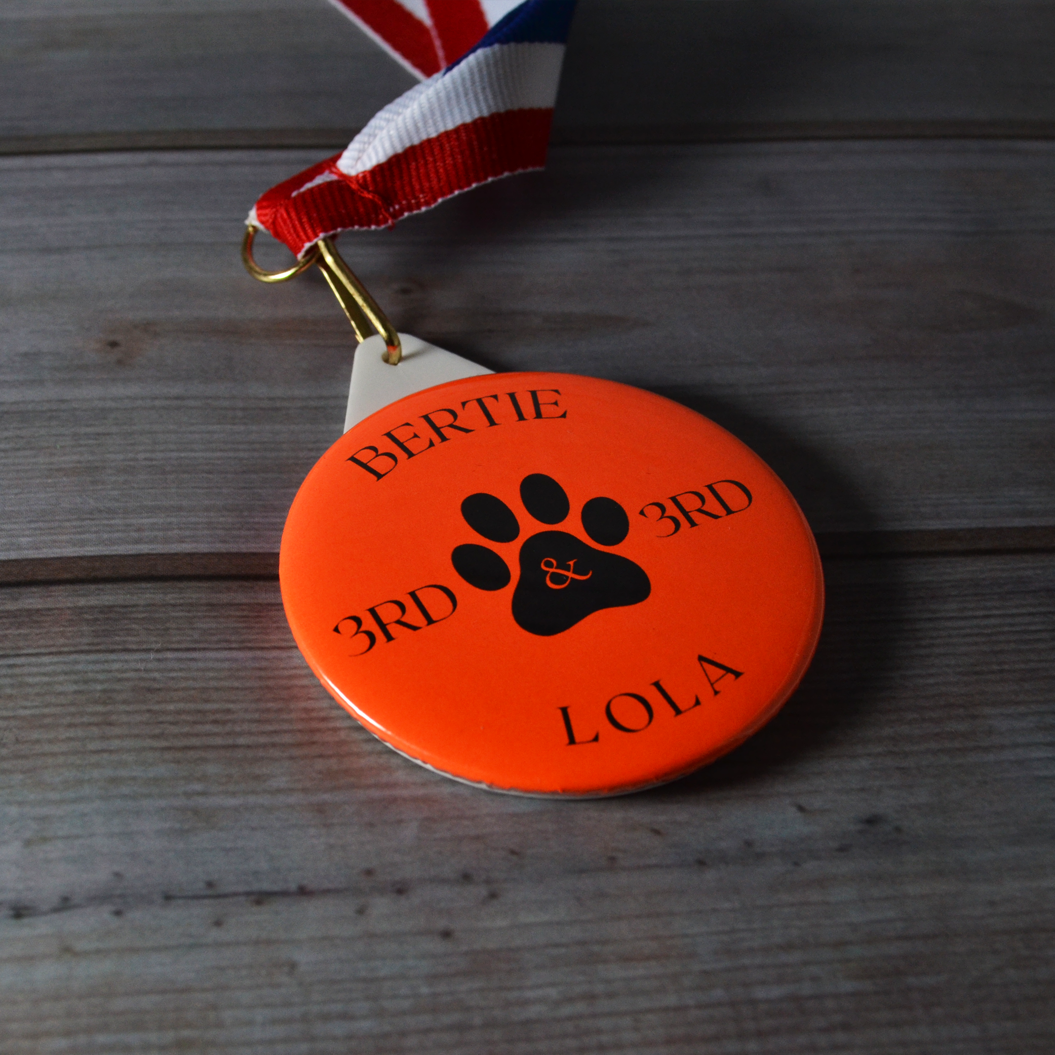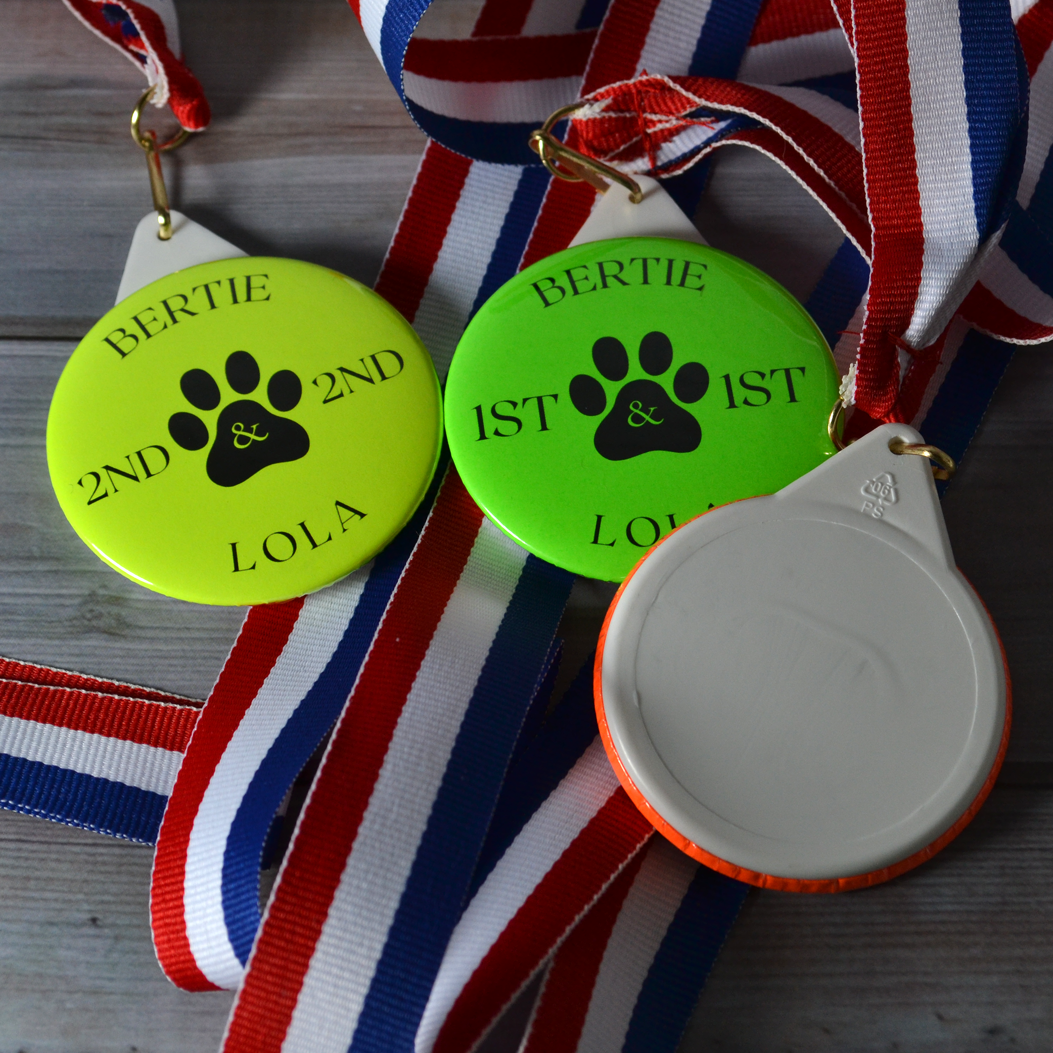 - 58mm plastic medals with a red, white and blue lanyard.